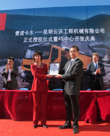 日前,雷諾卡車(上海)有限公司向昆明云沃工程機(jī)械有限公司正式授權(quán)并隆重開業(yè)。此家4S店是雷諾卡車在云南地區(qū)建立的第二家功能完備的4S店,它的建立不僅將協(xié)助雷諾卡車完善其營銷網(wǎng)絡(luò),也將助力雷諾卡車進(jìn)一步加強(qiáng)在專用底盤車市場的份額,提升自己在昆明地區(qū),乃至整個西南地區(qū)的品牌及企業(yè)形象。
