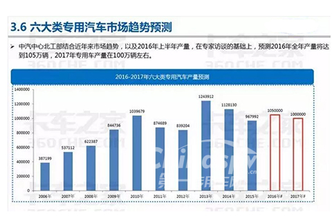 中期中心北工部結(jié)合近年來市場趨勢,以及2016年上半年產(chǎn)量,在專家訪談基礎(chǔ)上,預(yù)測2016年全年產(chǎn)量將達(dá)到105萬輛,2017年專用車產(chǎn)量在100萬輛左右。