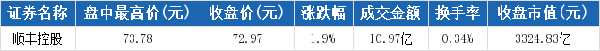 順豐市值再創(chuàng)歷史新高!2020年8月24日,順豐控股盤中最高價(jià)73.78元,股價(jià)創(chuàng)歷史新高。截至收盤,順豐控股最新價(jià)為72.97元,上漲1.9%,全日成交金額達(dá)到10.97億元,換手率0.34%。根據(jù)最新收盤價(jià)進(jìn)行計(jì)算,順豐控股總市值為3324.83億元。今年以來(lái),順豐控股市值漲幅已經(jīng)達(dá)到97.64%,接近翻番。