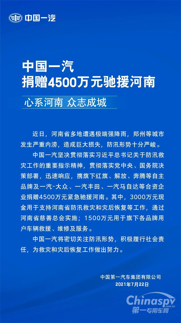 中國一汽堅(jiān)決貫徹落實(shí)習(xí)近平總書記關(guān)于防汛救災(zāi)工作的重要指示精神,貫徹落實(shí)黨中央、國務(wù)院決策部署,迅速響應(yīng),攜旗下紅旗、解放、奔騰等自主品牌及一汽-大眾、一汽豐田、一汽馬自達(dá)等合資企業(yè)捐贈(zèng)4500萬元緊急馳援河南。其中,3000萬元現(xiàn)金用于支持河南省防汛救災(zāi)和災(zāi)后恢復(fù)等工作,通過河南省慈善總會(huì)實(shí)施;1500萬元用于旗下各品牌用戶車輛救援、維修及服務(wù)。