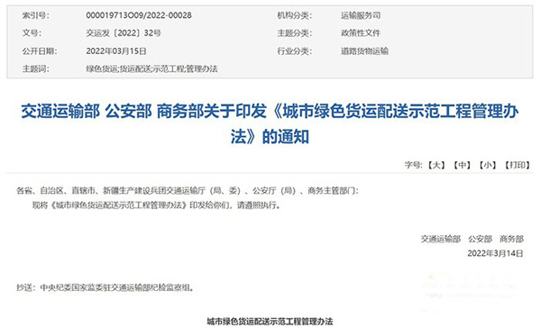 2022年3月15日,交通運輸部、公安部以及商務(wù)部聯(lián)合印發(fā)了《城市綠色貨運配送示范工程管理辦法》。制定該辦法,是為了加快推動城市貨運配送體系綠色低碳發(fā)展,進(jìn)一步加強(qiáng)城市綠色貨運配送示范工程管理工作規(guī)范化、制度化,保障示范工程建設(shè)有力有序推進(jìn),不斷提升城市綠色貨運配送發(fā)展水平,更好服務(wù)加快建設(shè)交通強(qiáng)國等國家戰(zhàn)略實施。