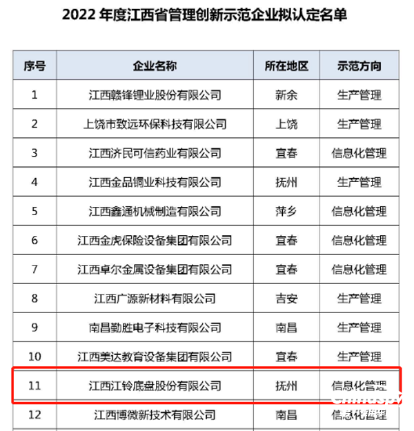 再獲省級“金字招牌” 江鈴底盤公司入選2022年江西省管理創(chuàng)新示范企業(yè)公示名單
