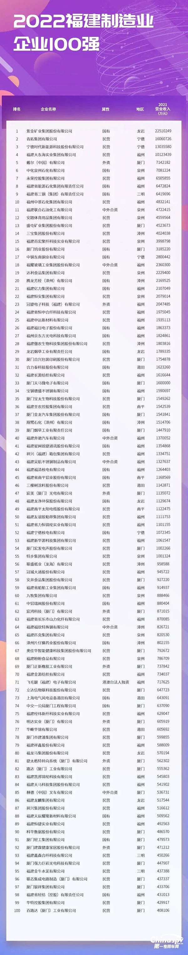 2022年12月9日第一專用車網(wǎng)記者獲悉,日前,2022福建企業(yè)100強發(fā)布大會,發(fā)布了2022福建企業(yè)100強、福建制造業(yè)企業(yè)100強、福建服務(wù)業(yè)企業(yè)100強、福建戰(zhàn)略性新興產(chǎn)業(yè)企業(yè)100強四個榜單。這是福建省持續(xù)樹立大型企業(yè)標(biāo)桿,發(fā)揮大型企業(yè)龍頭帶動作用,有效促進我省企業(yè)做大做強,依照中國企業(yè)聯(lián)合會研究發(fā)布“中國企業(yè)500強”的做法,經(jīng)評審委員會審定,福龍馬集團獲得“2022福建省制造業(yè)企業(yè)100強(排名第80位)”殊榮。