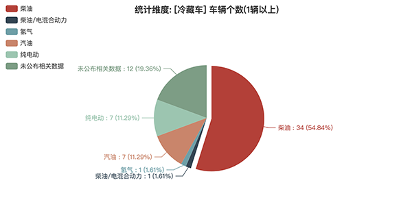本次公告中的62款冷藏車中,柴油(34輛,占比54.84%)、柴油/電混合動(dòng)力(1輛,占比1.61%)、氫氣(1輛,占比1.61%)、汽油(7輛,占比11.29%)、純電動(dòng)(7輛,占比11.29%)、未公布相關(guān)數(shù)據(jù)(12輛,占比19.35%)。
