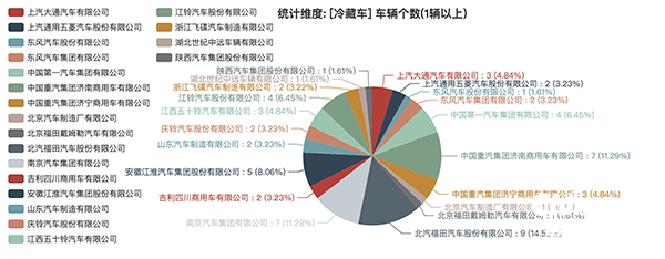 本次公告中的62輛冷藏車生產(chǎn)企業(yè)情況如下,上汽大通汽車有限公司(3輛,占比4.84%)、上汽通用五菱汽車股份有限公司(2輛,占比3.23%)、東風(fēng)汽車股份有限公司(1輛,占比1.61%)、東風(fēng)汽車集團(tuán)有限公司(2輛,占比3.23%)、中國(guó)第一汽車集團(tuán)有限公司(4輛,占比6.45%)、中國(guó)重汽集團(tuán)濟(jì)南商用車有限公司(7輛,占比11.29%)、中國(guó)重汽集團(tuán)濟(jì)寧商用車有限公司(3輛,占比4.84%)、北京汽車制造廠有限公司(1輛,占比1.61%)、北京福田戴姆勒汽車有限公司(1輛,占比1.61%)、北汽福田汽車股份有限公司(9輛,占比14.52%)、南京汽車集團(tuán)有限公司(7輛,占比11.29%)、吉利四川商用車有限公司(2輛,占比3.23%)、安徽江淮汽車集團(tuán)股份有限公司(5輛,占比8.06%)、山東汽車制造有限公司(2輛,占比3.23%)、慶鈴汽車股份有限公司(2輛,占比3.23%)、江西五十鈴汽車有限公司(3輛,占比4.84%)、江鈴汽車股份有限公司(4輛,占比6.45%)、浙江飛碟汽車制造有限公司(2輛,占比3.23%)、湖北世紀(jì)中遠(yuǎn)車輛有限公司(1輛,占比1.61%)、陜西汽車集團(tuán)股份有限公司(1輛,占比1.61%)。