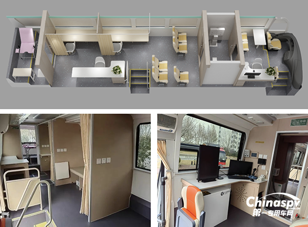 車內(nèi)功能齊全,采用DR+心電+ B超+婦科+化驗(yàn)區(qū)的布局,配備X線機(jī)、DR設(shè)備、電離室、信息識別、醫(yī)用顯示器等先進(jìn)儀器設(shè)備,同時鉛房為6面防護(hù),高于GBZ130-2020放射診斷放射防護(hù)要求。車內(nèi)的工作臺均為圓角,有效防止碰傷。