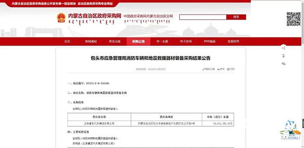 2022年12月30日,內(nèi)蒙古自治區(qū)政府采購網(wǎng)發(fā)布了《包頭市應急管理局消防車輛和地震救援器材裝備采購結(jié)果公告》,北奔重汽成功中標包頭市應急管理局消防車輛和地震救援器材裝備采購項目,中標(成交)金額近億元。