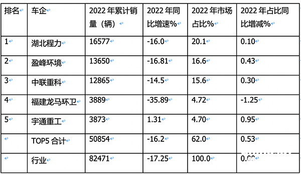 表5,根據(jù)終端上牌數(shù)據(jù),2022年環(huán)衛(wèi)車銷量top5排行如下: