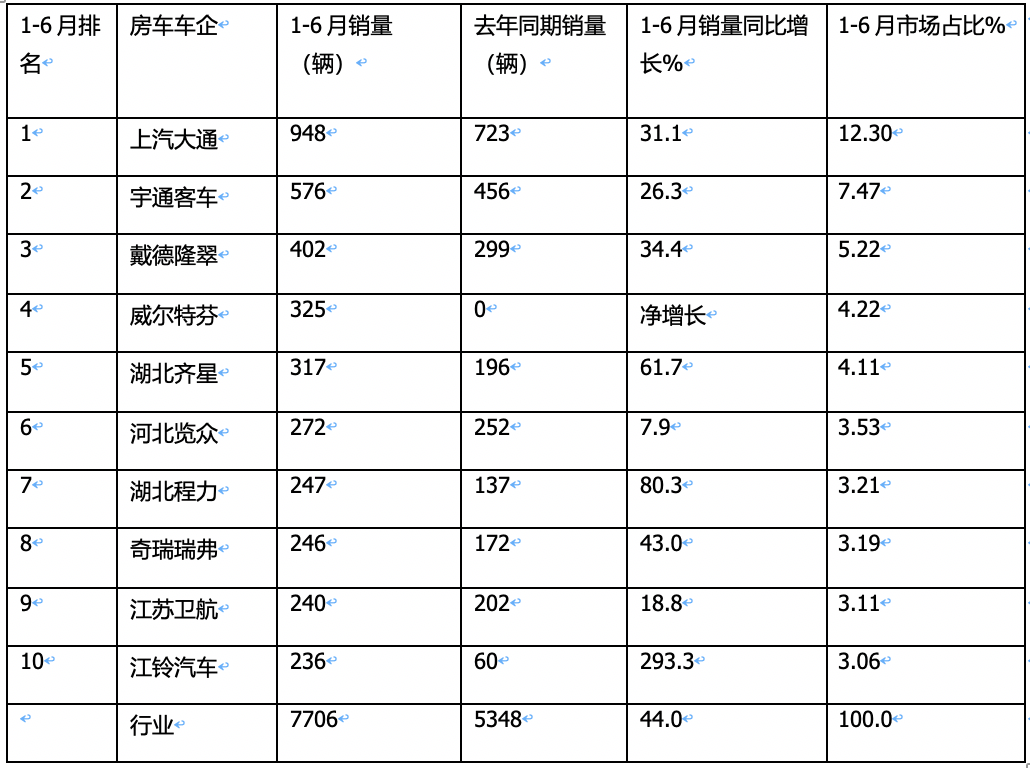 實(shí)銷7706輛增44%,大通、宇通、戴德隆翠居前三-2023年上半年國(guó)產(chǎn)底盤自行式房車銷量特點(diǎn)簡(jiǎn)析