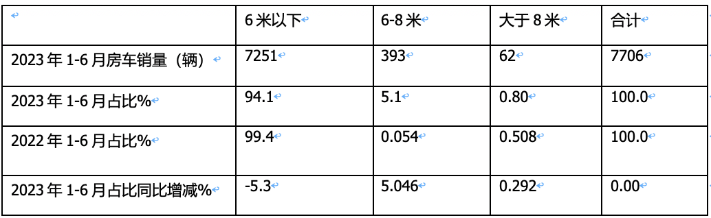 表4,按車型長(zhǎng)度段劃分,2023年1-6月與2022年同期房車市場(chǎng)銷量及占比同比增減統(tǒng)計(jì)(數(shù)據(jù)來(lái)源:終端上牌信息)