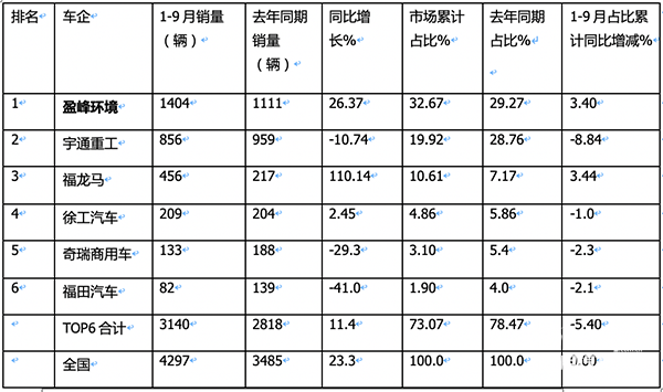 ----盈峰環(huán)境累計銷售1404輛,居行業(yè)第一,累計同比增長26.37%,跑贏大盤, 市場中占有率為32.67%,占比同比增加3.4個百分點,是行業(yè)市場份額增加最大的車企,表現(xiàn)出色;