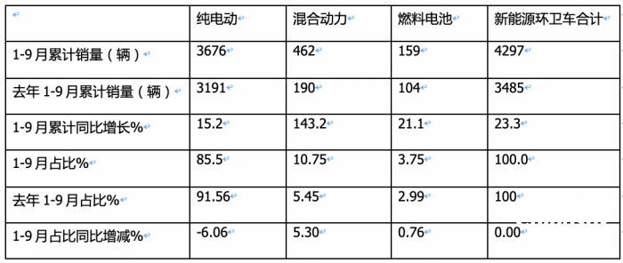 上表顯示:在今年1-9月各類新能源環(huán)衛(wèi)車銷量同比中: