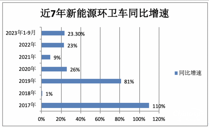 從上圖可見,2023年1-9月新能源環(huán)衛(wèi)車同比增速為23.3%,位居近7年第四,居于中等水平。說明今年1-9月的新能源環(huán)衛(wèi)車增長勢頭與近年比處于正常年份水平。
