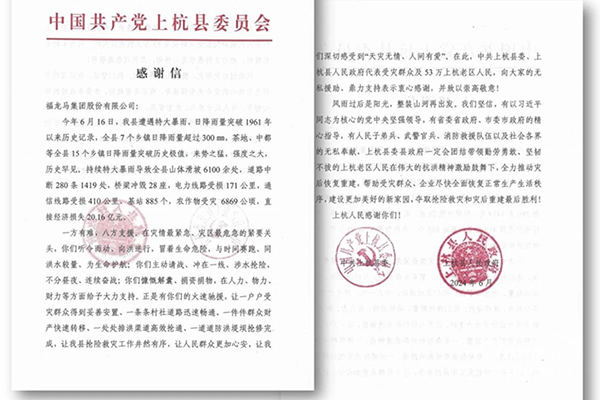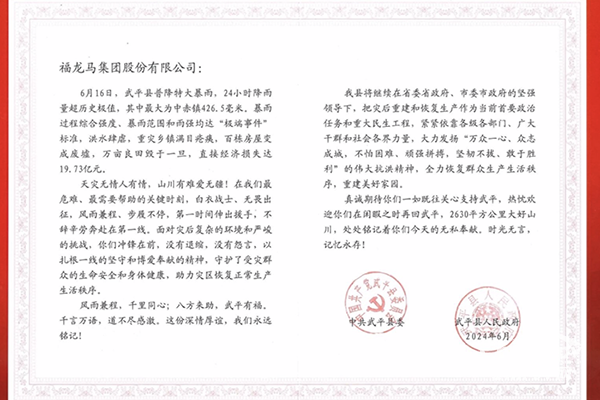 近日,福龍馬集團收到中共上杭縣委、上杭縣人民政府以及中共武平縣委和武平縣人民政府頒發(fā)的感謝信和錦旗,對福龍馬在“6•16”特大暴雨中的災(zāi)后重建工作中給予的傾力支援表達感謝。