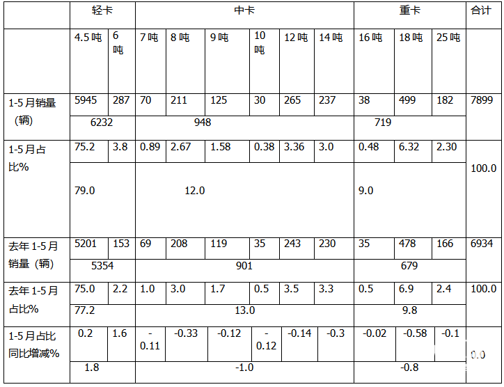 ---中卡型累計銷售948輛,占比12%,其中12噸車型銷售265輛,占比3.36%,14噸車型銷量237輛,占比3.0%,分別居中卡車型第一和第二;