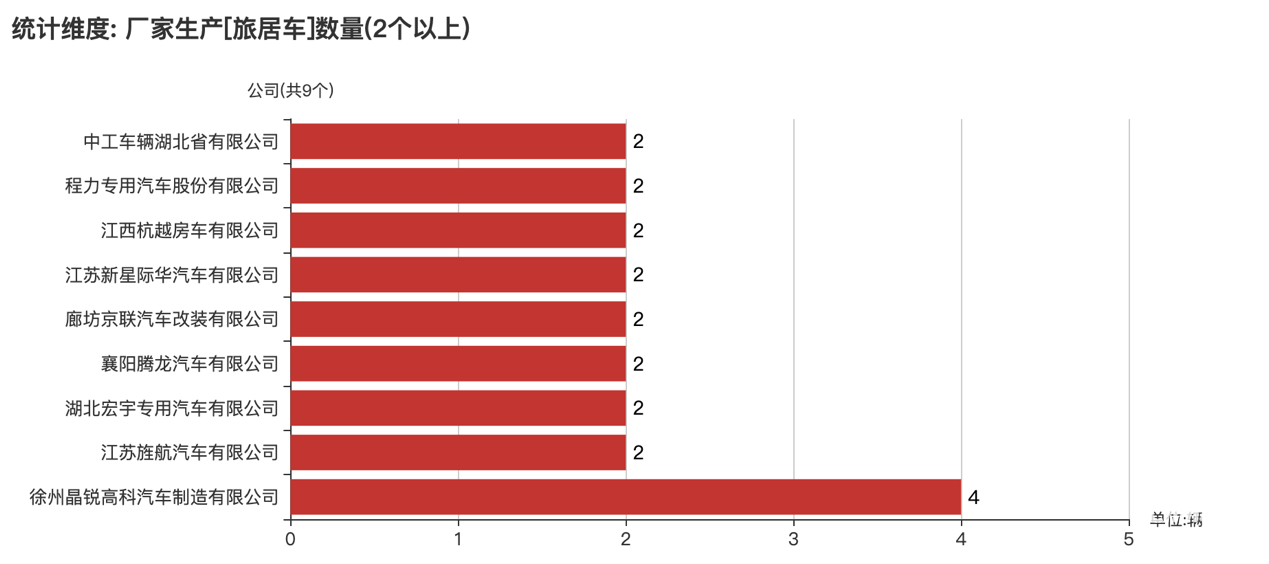 本次公告中的51款旅居車的生產(chǎn)企業(yè)共有40家,徐州晶銳高科汽車制造有限公司(4輛)、江蘇新星際華汽車有限公司(2輛)、江西杭越房車有限公司(2輛)、襄陽騰龍汽車有限公司(2輛)、江蘇旌航汽車有限公司(2輛)、程力專用汽車股份有限公司(2輛)、中工車輛湖北省有限公司(2輛)、廊坊京聯(lián)汽車改裝有限公司(2輛)、湖北宏宇專用汽車有限公司(2輛)、湖北瑞力汽車有限公司(1輛)、山東威士捷房車制造有限公司(1輛)、淄博恒立汽車制造有限公司(1輛)、鴻運汽車有限公司(1輛)、江蘇法美瑞汽車有限公司(1輛)、程力汽車集團股份有限公司(1輛)、山西普瑞萊斯汽車制造有限公司(1輛)、湖北四通專用汽車有限公司(1輛)、臨沂程通掛車制造有限公司(1輛)、湖北威爾特芬房車科技有限公司(1輛)、南京英德利汽車有限公司(1輛)、河北長安汽車有限公司(1輛)、重慶菜德機械制造有限公司(1輛)、江蘇振翔車輛裝備股份有限公司(1輛)、湖北浩天專用汽車有限公司(1輛)、安徽江淮專用汽車有限公司(1輛)、浙江淼盛汽車有限公司(1輛)、零八一電子集團四川紅輪機械有限公司(1輛)、山東巨威汽車制造有限公司(1輛)、湖北中恒汽車裝備有限公司(1輛)、黑系智能裝備(威海)有限公司(1輛)、江蘇賽沸爾專用汽車有限公司(1輛)、藍(lán)際智能裝備(威海)有限公司(1輛)、湖北大力專用汽車制造有限公司(1輛)、眾銳工設(shè)(山東)房車制造有限公司(1輛)、河北覽眾專用汽車制造有限公司(1輛)、鄭州神汽汽車技術(shù)發(fā)展有限公司(1輛)、武漢市政環(huán)衛(wèi)機械有限公司(1輛)、威海子和智能裝備股份有限公司(1輛)、洛陽朗宸汽車有限公司(1輛)、重慶金冠汽車制造股份有限公司(1輛)。