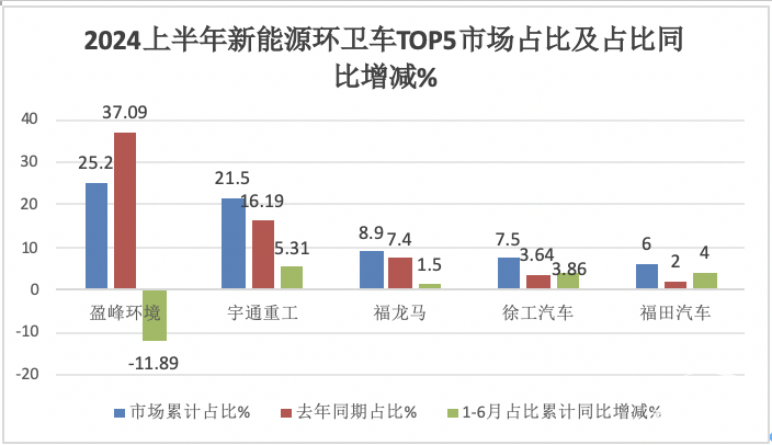 在今年前6月新能源環(huán)衛(wèi)車市場競爭格局中,盈峰環(huán)境領(lǐng)跑,但占比同比市場份額減少最多;宇通占比同比增加5.31個百分點,是占比同比增加最多的車企,表現(xiàn)搶眼。