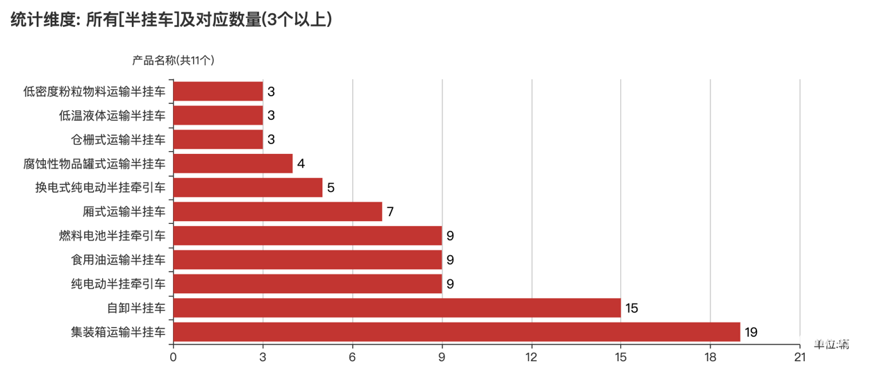 本次公告中的113款半掛車的車型共有30種,集裝箱運(yùn)輸半掛車(19輛)、自卸半掛車(15輛)、燃料電池半掛牽引車(9輛)、純電動半掛牽引車(9輛)、食用油運(yùn)輸半掛車(9輛)、廂式運(yùn)輸半掛車(7輛)、換電式純電動半掛牽引車(5輛)、腐蝕性物品罐式運(yùn)輸半掛車(4輛)、低密度粉粒物料運(yùn)輸半掛車(3輛)、低溫液體運(yùn)輸半掛車(3輛)、倉柵式運(yùn)輸半掛車(3輛)、垃圾轉(zhuǎn)運(yùn)半掛車(2輛)、連續(xù)油管作業(yè)半掛車(2輛)、半掛牽引車(2輛)、低平板半掛車(2輛)、氧化性物品罐式運(yùn)輸半掛車(2輛)、鋁合金食用油運(yùn)輸半掛車(2輛)、液態(tài)食品運(yùn)輸半掛車(2輛)、易燃液體罐式運(yùn)輸半掛車(2輛)、危險品罐箱骨架運(yùn)輸半掛車(1輛)、雜項危險物品罐式運(yùn)輸半掛車(1輛)、液化氣體運(yùn)輸半掛車(1輛)、平板運(yùn)輸半掛車(1輛)、冷藏半掛車(1輛)、散裝糧食運(yùn)輸半掛車(1輛)、普通液體運(yùn)輸半掛車(1輛)、平頭天然氣半掛牽引車(1輛)、側(cè)面自裝卸半掛車(1輛)、半掛牽引汽車(1輛)、電視半掛車(1輛)。