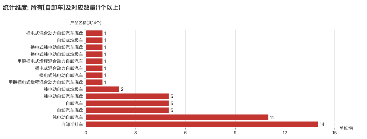 本次公告中的50款自卸車的車型共有14種,自卸半掛車(14輛)、純電動(dòng)自卸汽車(11輛)、自卸汽車底盤(5輛)、自卸汽車(5輛)、純電動(dòng)自卸汽車底盤(5輛)、純電動(dòng)自卸式垃圾車(2輛)、甲醇插電式增程混合動(dòng)力自卸汽車底盤(1輛)、換電式純電動(dòng)自卸汽車(1輛)、插電式混合動(dòng)力自卸汽車(1輛)、甲醇插電式增程混合動(dòng)力自卸汽車(1輛)、換電式純電動(dòng)自卸式垃圾車(1輛)、換電式純電動(dòng)自卸汽車底盤(1輛)、自卸式垃圾車(1輛)、插電式混合動(dòng)力自卸汽車底盤(1輛)。