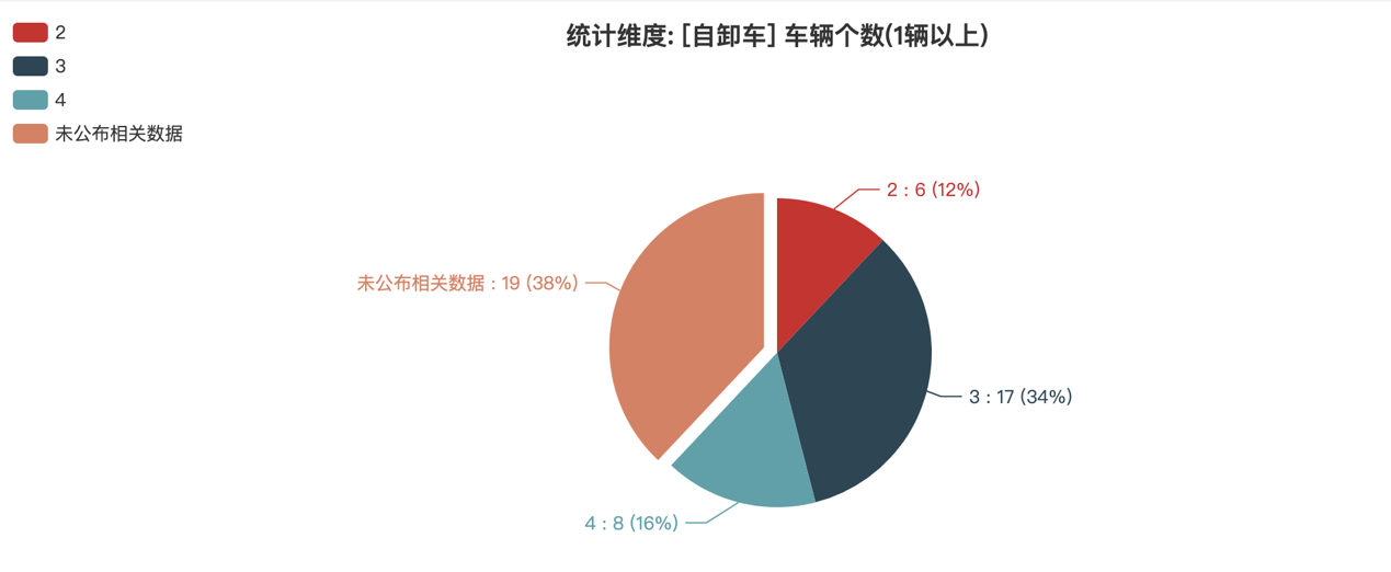 本次公告中的50款自卸車中,車型軸數(shù)情況如下:2軸(6輛,占比12%)、3軸(17輛,占比34%)、4軸(8輛,占比16%)、未公布相關(guān)數(shù)據(jù)(19輛,占比38%)。
