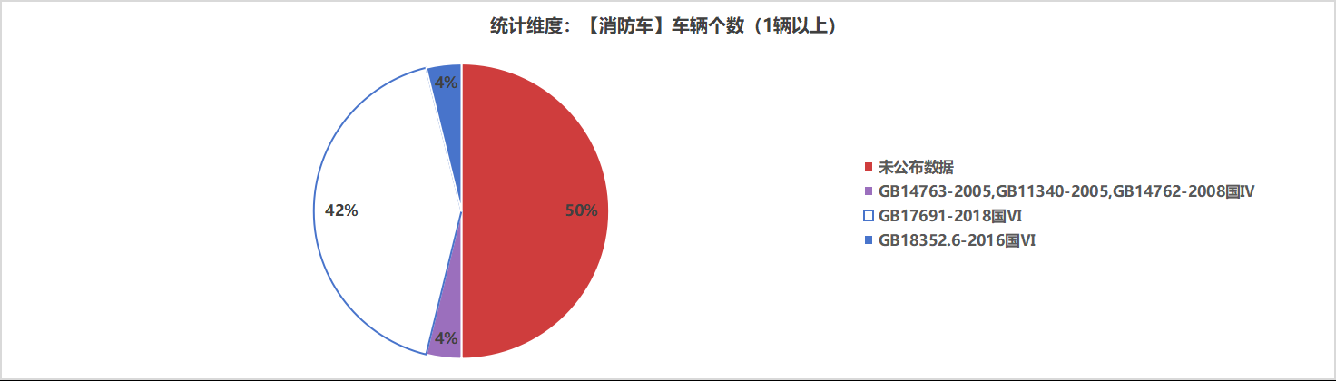 本次公告中的26款消防車(chē)中,GB14763-2005,GB11340-2005,GB14762-2008國(guó)Ⅳ(1輛,占比3.8%)、GB17691-2018國(guó)Ⅵ(11輛,占比42.3%)、GB18352.6-2016國(guó)Ⅵ(1輛,占比3.8%)、未公布相關(guān)數(shù)據(jù)(13輛,占比50.0%)。