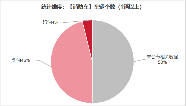 本次公告中的26款消防車(chē)中,柴油(12輛,占比46.2%)、汽油(1輛,占比3.8%)、未公布相關(guān)數(shù)據(jù)(13輛,占比50.0%)。