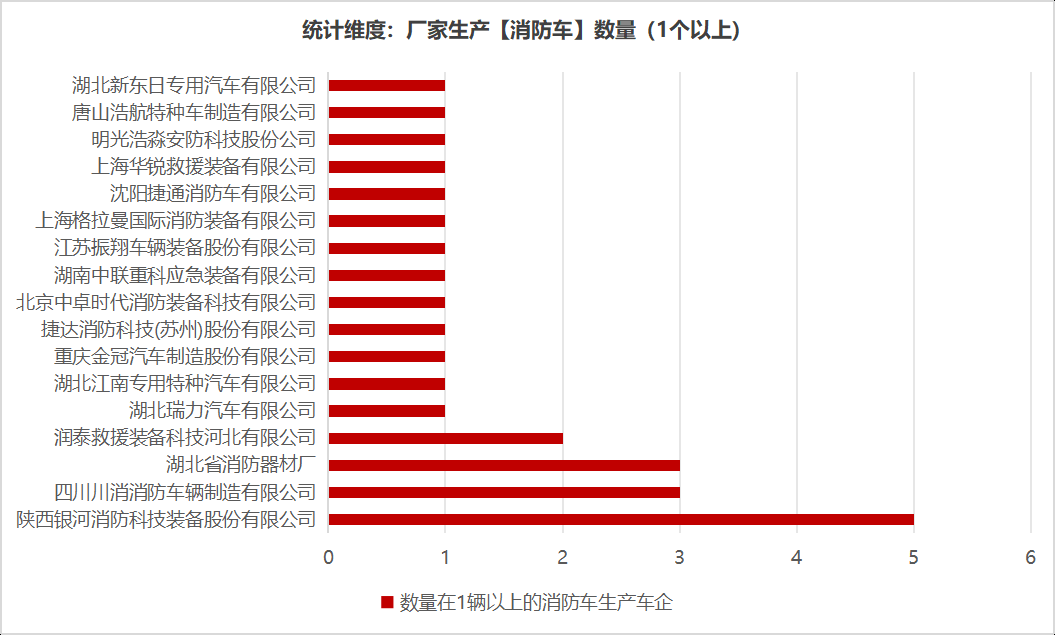本次公告中的26款消防車(chē)的生產(chǎn)企業(yè)共有17家,陜西銀河消防科技裝備股份有限公司(5輛)、四川川消消防車(chē)輛制造有限公司(3輛)、湖北省消防器材廠(3輛)、潤(rùn)泰救援裝備科技河北有限公司(2輛)、湖北瑞力汽車(chē)有限公司(1輛)、湖北江南專(zhuān)用特種汽車(chē)有限公司(1輛)、重慶金冠汽車(chē)制造股份有限公司(1輛)、捷達(dá)消防科技(蘇州)股份有限公司(1輛)、北京中卓時(shí)代消防裝備科技有限公司(1輛)、湖南中聯(lián)重科應(yīng)急裝備有限公司(1輛)、江蘇振翔車(chē)輛裝備股份有限公司(1輛)、上海格拉曼國(guó)際消防裝備有限公司(1輛)、上海格拉曼國(guó)際消防裝備有限公司(1輛)、上海華銳救援裝備有限公司(1輛)、明光浩淼安防科技股份公司(1輛)、唐山浩航特種車(chē)制造有限公司(1輛)、湖北新東日專(zhuān)用汽車(chē)有限公司(1輛)。