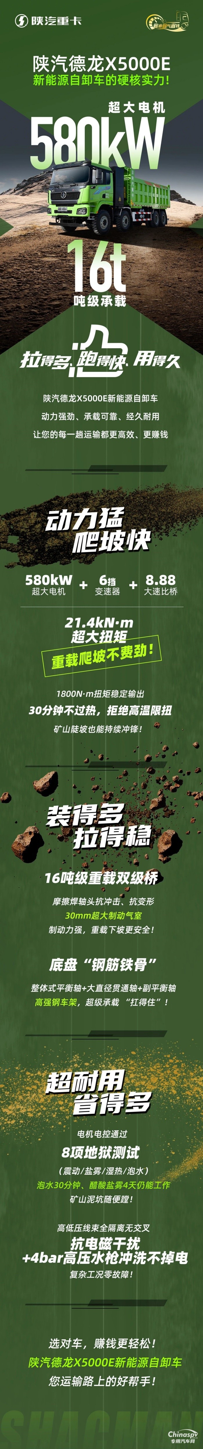 【產(chǎn)品引領(lǐng)】580kW超大電機(jī)+16噸級(jí)承載∣陜汽德龍X5000E新能源自卸車的硬核實(shí)力!