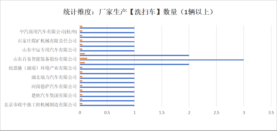 本次公告中的22款洗掃車的生產(chǎn)企業(yè)共有18家,北京市政中燕工程機械制造有限公司(1輛)、程力專用汽車股份有限公司(1輛)、楚勝汽車集團有限公司(1輛)、河北萬利特種車輛制造有限公司(1輛)、河南德薩汽車有限公司(1輛)、河南億翔專用汽車有限公司(1輛)、湖北瑞力汽車有限公司(1輛)、湖北馨雅通達汽車科技有限公司(1輛)、紐恩馳(湖南)環(huán)境產(chǎn)業(yè)有限公司(1輛)、三一環(huán)境產(chǎn)業(yè)有限公司(2輛)、山東百易智能裝備股份有限公司(3輛)、山東祥農(nóng)專用車輛有限公司(2輛)、山東中運專用汽車有限公司(1輛)、陜汽大同專用汽車有限公司(1輛)、石家莊煤礦機械有限責(zé)任公司(1輛)、長沙中聯(lián)重科環(huán)境產(chǎn)業(yè)有限公司(1輛)、中汽商用汽車有限公司(杭州)(1輛)、中植一客成都汽車有限公司(1輛)。