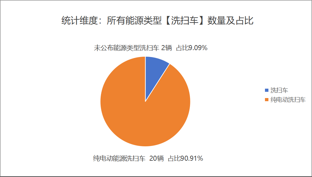 本次公告中的22款洗掃車中,純電動洗掃車(20輛,占比95.24%)、未公布能源情況(2輛,占比4.76%)。