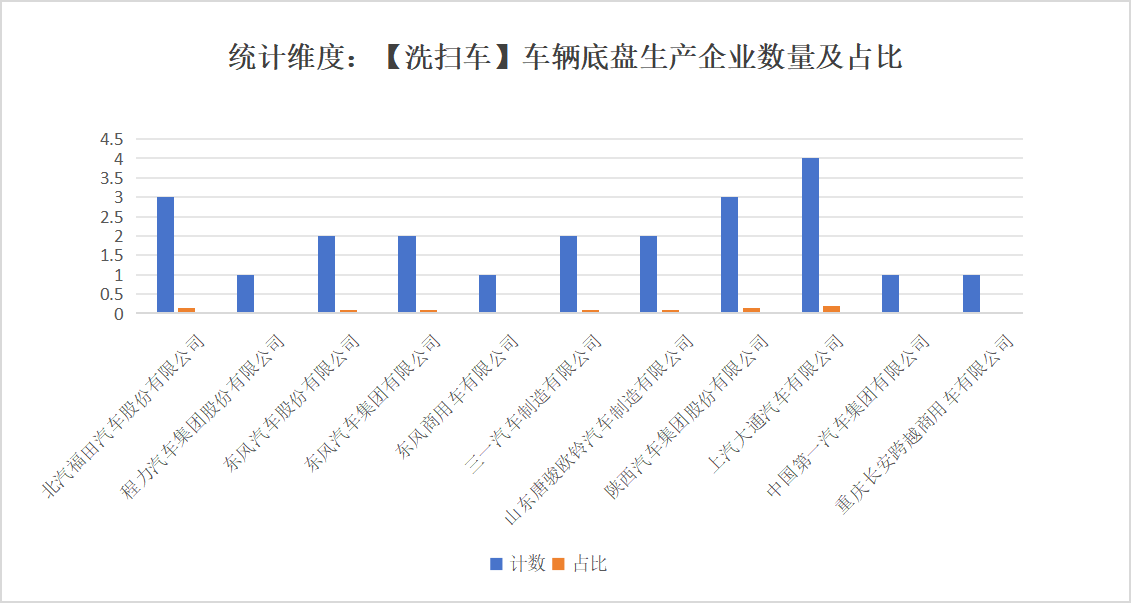 本次公告中的22款洗掃車的底盤生產(chǎn)企業(yè)共有11家,北汽福田汽車股份有限公司(3輛,占比13.6%)、程力汽車集團股份有限公司(1輛,占比4.5%)、東風(fēng)汽車股份有限公司(2輛,占比9.1%)、東風(fēng)汽車集團有限公司(2輛,占比9.1%)、東風(fēng)商用車有限公司(1輛,占比4.8%)、三一汽車制造有限公司(2輛,占比9.1%)、山東唐駿歐鈴汽車制造有限公司(2輛,占比9.1%)、陜西汽車集團股份有限公司(3輛,占比13.6%)、上汽大通汽車有限公司(4輛,占比18.2%)、中國第一汽車集團有限公司(1輛,占比4.5%)、重慶長安跨越商用車有限公司(1輛,占比4.5%)。本次公告中的22款洗掃車中,均采用二類底盤。