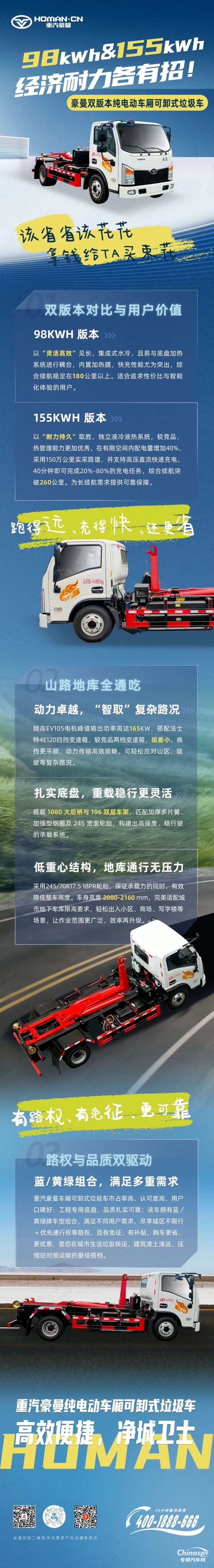 豪曼雙版本純電動車廂可卸式垃圾車 | 98kWh&155kWh,經(jīng)濟(jì)耐力各有招!