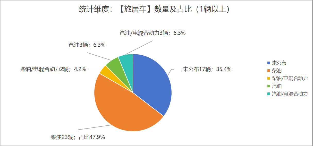 本次公告中的48款旅居車中,柴油(23輛,占比47.9%)、汽油(3輛,占比6.3%)、汽油/電混合動(dòng)力(3輛,占比6.3%)、柴油/電混合動(dòng)力(2輛,占比4.2%)、未公布相關(guān)數(shù)據(jù)(17輛,占比35.4%)。
