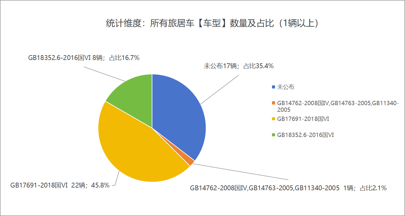 本次公告中的48款旅居車中,GB14762-2008國(guó)Ⅳ,GB14763-2005,GB11340-2005(1輛,占比2.1%)、GB17691-2018國(guó)Ⅵ(22輛,占比45.8%)、GB18352.6-2016國(guó)Ⅵ(8輛,占比16.7%)、未公布相關(guān)數(shù)據(jù)(17輛,占比35.4%)。