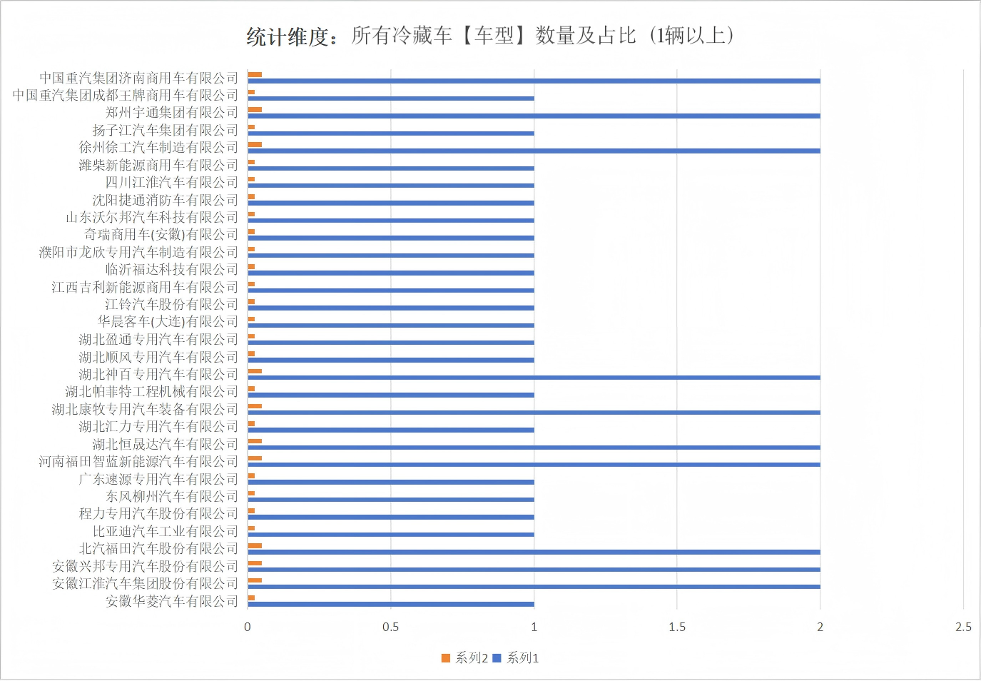 本次公告中的22款冷藏車的底盤生產(chǎn)企業(yè)共有25家,安徽華菱汽車有限公司(1輛)、安徽江淮汽車集團股份有限公司(2輛)、北京福田戴姆勒汽車有限公司(2輛)、北汽福田汽車股份有限公司(4輛)、比亞迪汽車工業(yè)有限公司(2輛)、東風柳州汽車有限公司(1輛)、東風商用車有限公司(1輛)、廣西汽車集團有限公司(1輛)、河南福田智藍新能源汽車有限公司(2輛)、江鈴汽車股份有限公司(2輛)、江西吉利新能源商用車有限公司(1輛)、南京汽車集團有限公司(1輛)、奇瑞商用車(安徽)有限公司(1輛)、慶鈴汽車股份有限公司(1輛)、山東唐駿歐鈴汽車制造有限公司(2輛)、上汽通用五菱汽車股份有限公司(1輛)、四川江淮汽車有限公司(1輛)、濰柴新能源商用車有限公司(1輛)、鑫源汽車有限公司(1輛)、徐州徐工汽車制造有限公司(2輛)、鄭州宇通集團有限公司(2輛)、中國重汽集團成都王牌商用車有限公司(1輛)、中國重汽集團濟南卡車股份有限公司(2輛)、中國重汽集團濟南商用車有限公司(4輛)、中國重汽集團濟寧商用車有限公司(1輛)。