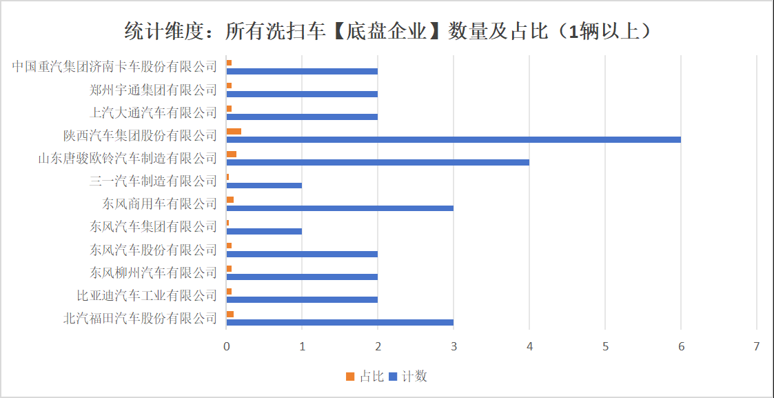 本次公告中的30款洗掃車的底盤生產(chǎn)企業(yè)共有12家,北汽福田汽車股份有限公司(3輛,占比10.0%)、比亞迪汽車工業(yè)有限公司(2輛,占比6.7%)、東風(fēng)柳州汽車有限公司(2輛,占比6.7%)、東風(fēng)汽車股份有限公司(2輛,占比6.7%)、東風(fēng)汽車集團(tuán)有限公司(1輛,占比3.3%)、東風(fēng)商用車有限公司(3輛,占比10.0%)、三一汽車制造有限公司(1輛,占比3.3%)、山東唐駿歐鈴汽車制造有限公司(4輛,占比13.3%)、陜西汽車集團(tuán)股份有限公司(6輛,占比20.0%)、上汽大通汽車有限公司(2輛,占比6.7%)、鄭州宇通集團(tuán)有限公司(2輛,占比6.7%)、中國(guó)重汽集團(tuán)濟(jì)南卡車股份有限公司(2輛,占比6.7%)。本次公告中的30款洗掃車中,均采用二類底盤。