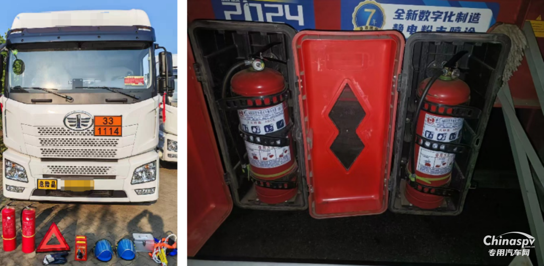 (1)車輛須配備2個4KG以上干粉滅火器, 駕駛室內應配備1個不小于1KG的滅火器,且完好有效,便于取用。