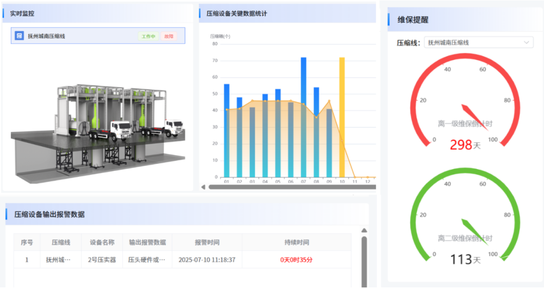 AI實時掃描料位狀態(tài),當容器料位達到預(yù)警高度,系統(tǒng)自動觸發(fā)強力壓縮程序,智控減容,壓縮處理效率提升21%,全程無需人員干預(yù)值守。