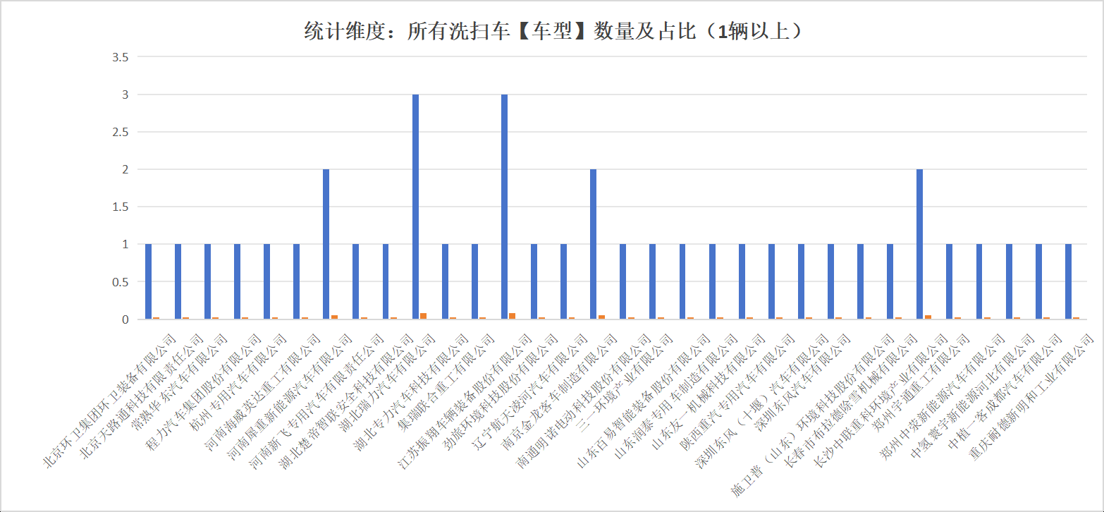 本次公告中的39款洗掃車的生產(chǎn)企業(yè)共有32家,河南海威英達(dá)重工有限公司(1輛)、河南犀重新能源汽車有限公司(2輛)、河南新飛專用汽車有限責(zé)任公司(1輛)、湖北楚帝智聯(lián)安全科技有限公司(1輛)、湖北瑞力汽車有限公司(3輛)、湖北專力汽車科技有限公司(1輛)、集瑞聯(lián)合重工有限公司(1輛)、江蘇振翔車輛裝備股份有限公司(3輛)、勁旅環(huán)境科技股份有限公司(1輛)、遼寧航天凌河汽車有限公司(1輛)、南京金龍客車制造有限公司(2輛)、南通明諾電動科技股份有限公司(1輛)、三一環(huán)境產(chǎn)業(yè)有限公司(1輛)、山東百易智能裝備股份有限公司(1輛)、山東潤泰專用車制造有限公司(1輛)、山東友一機(jī)械科技有限公司(1輛)、陜西重汽專用汽車有限公司(1輛)、深圳東風(fēng)(十堰)汽車有限公司(1輛)、深圳東風(fēng)汽車有限公司(1輛)、施衛(wèi)普(山東)環(huán)境科技股份有限公司(1輛)、長春市布拉德除雪機(jī)械有限公司(1輛)、長沙中聯(lián)重科環(huán)境產(chǎn)業(yè)有限公司(2輛)、鄭州宇通重工有限公司(1輛)、鄭州中滎新能源汽車有限公司(1輛)、中氫寰宇新能源河北有限公司(1輛)、中植一客成都汽車有限公司(1輛)、重慶耐德新明和工業(yè)有限公司(1輛)。