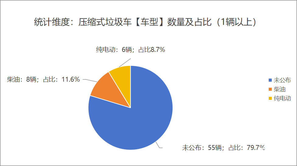 本次公告中的69款垃圾車中,柴油(8輛,占比11.6%)、純電動(6輛,占比8.7%)、未公布相關(guān)數(shù)據(jù)(55輛,占比79.7%)。