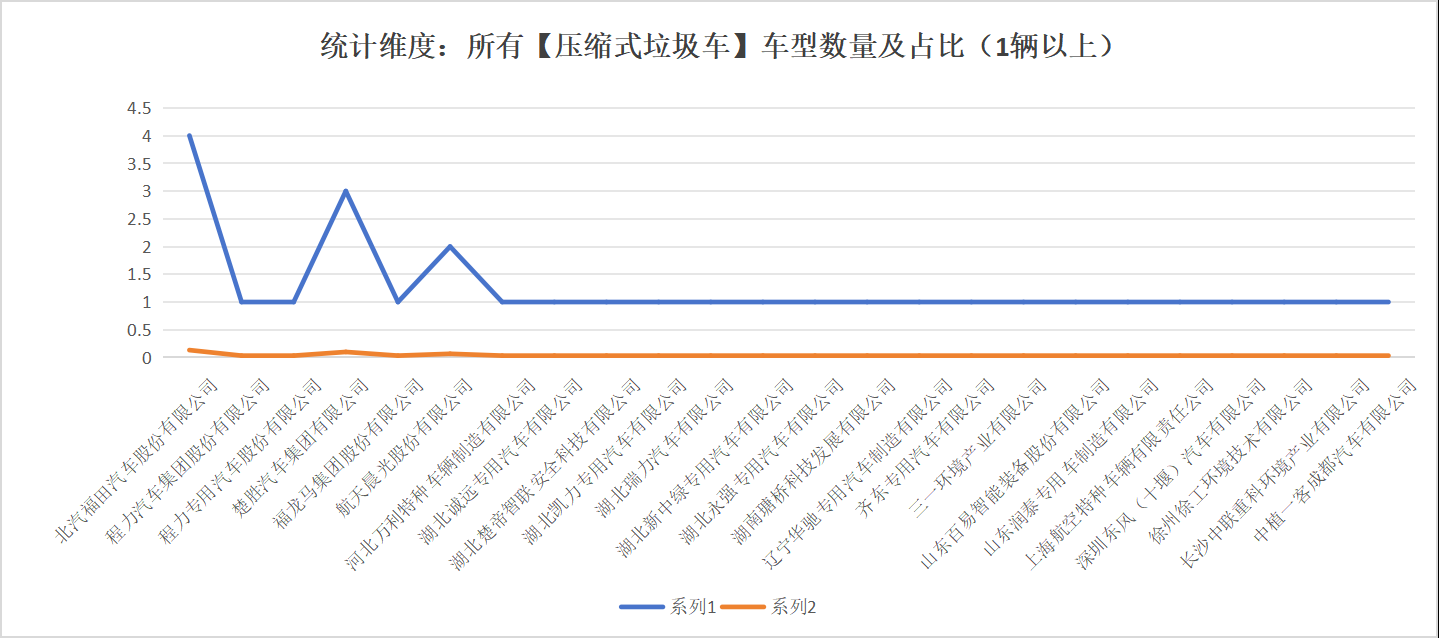 未公布數(shù)據(jù)的垃圾車企業(yè)以及數(shù)量如下:北汽福田汽車股份有限公司(3輛)、程力專用汽車股份有限公司(1輛)、楚勝汽車集團(tuán)有限公司(1輛)、福龍馬集團(tuán)股份有限公司(1輛)、航天晨光股份有限公司(1輛)、河北萬利特種車輛制造有限公司(1輛)、湖北楚帝智聯(lián)安全科技有限公司(1輛)、湖北新中綠專用汽車有限公司(1輛)、湖北永強(qiáng)專用汽車有限公司(1輛)、湖南瑭橋科技發(fā)展有限公司(1輛)、遼寧華馳專用汽車制造有限公司(1輛)、三一環(huán)境產(chǎn)業(yè)有限公司(1輛)、山東潤泰專用車制造有限公司(1輛)、上海航空特種車輛有限責(zé)任公司(1輛)、徐州徐工環(huán)境技術(shù)有限公司(1輛)、長沙中聯(lián)重科環(huán)境產(chǎn)業(yè)有限公司(1輛)、中植一客成都汽車有限公司(1輛)。