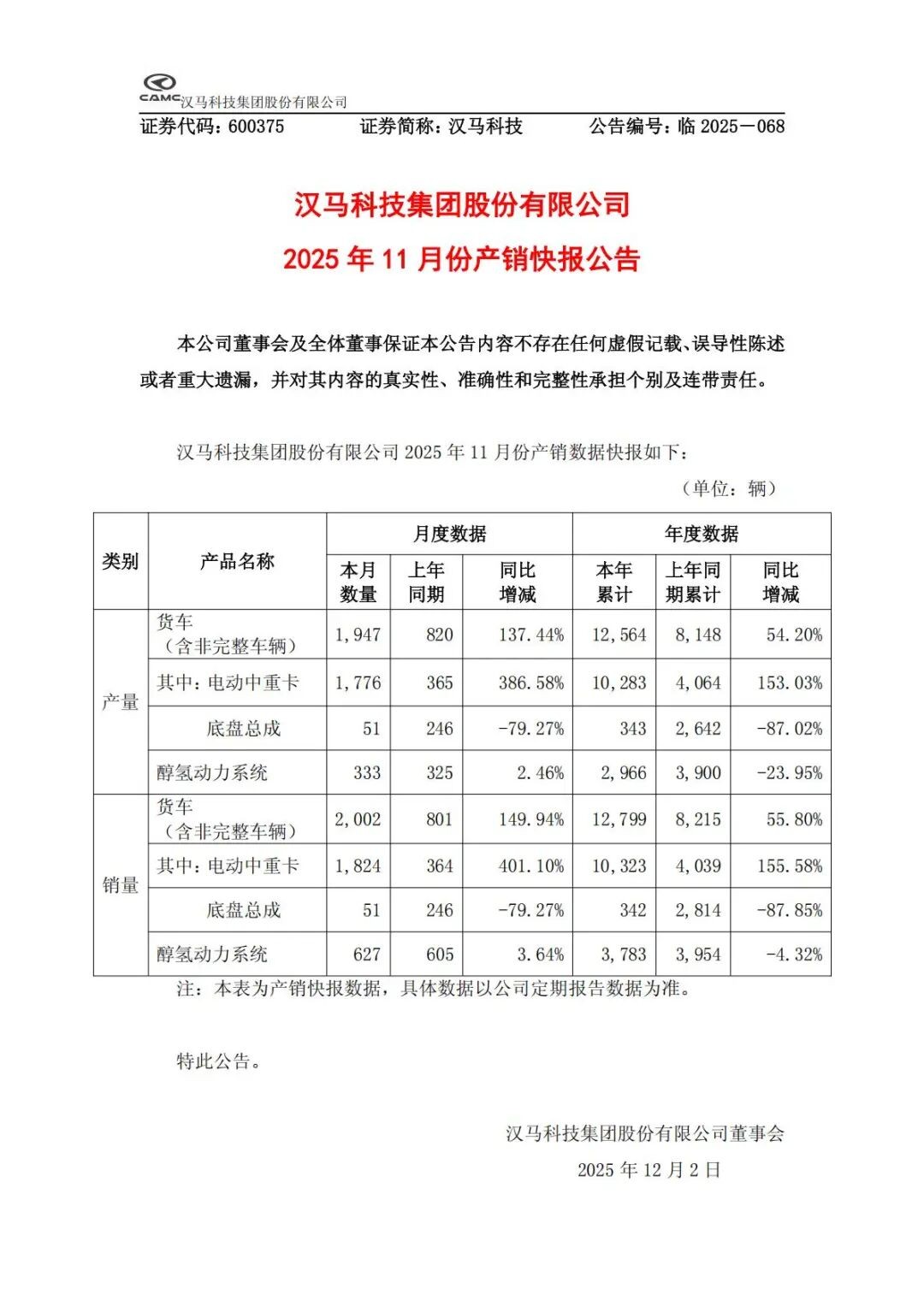 12月1日,漢馬科技發(fā)布2025年11月產(chǎn)銷(xiāo)快報(bào)。數(shù)據(jù)顯示,漢馬科技11月貨車(chē)銷(xiāo)量達(dá)2002輛,同比增長(zhǎng)149.94%。其中,新能源中重卡表現(xiàn)更是亮眼,單月產(chǎn)銷(xiāo)同比增長(zhǎng)分別達(dá)386.58%與401.10%,強(qiáng)勁領(lǐng)跑行業(yè)賽道;1-11月累計(jì)產(chǎn)銷(xiāo)同比亦實(shí)現(xiàn)153.03%和155.58%大幅增長(zhǎng)。當(dāng)月產(chǎn)值超9億元,創(chuàng)近年來(lái)單月最佳成績(jī),彰顯漢馬科技在新能源轉(zhuǎn)型戰(zhàn)略下價(jià)值優(yōu)勢(shì)。