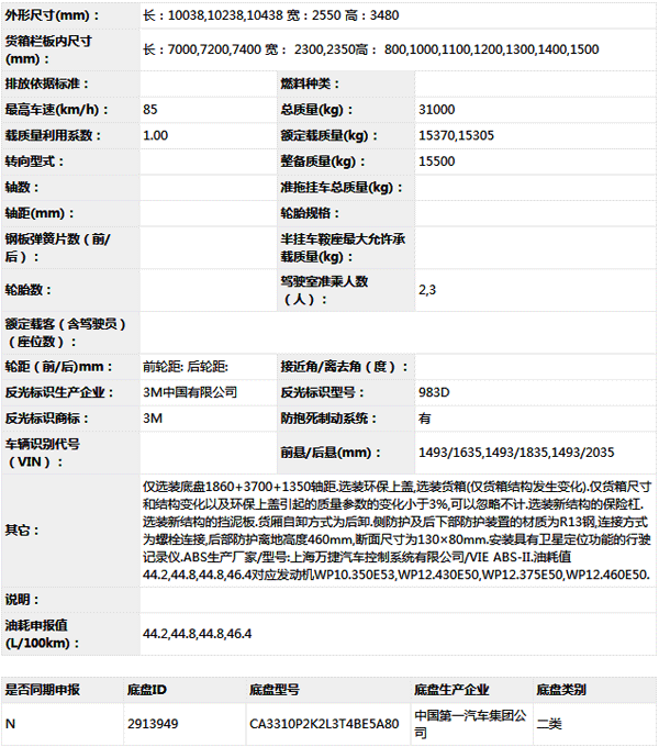 公告型號(hào) CA5311ZLJP2K2L3T4E5A80
