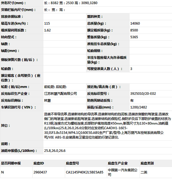公告型號(hào) CA5144ZKXP40K2L5E5A85