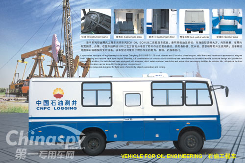 凌宇系列石油廂式工程車采用東風(fēng)EQ1108、EQ1126二類載貨車底盤,康明斯柴油發(fā)動機(jī);車身造型流暢大方,內(nèi)飾典雅,車廂內(nèi)布置簡潔、合理,在整車結(jié)構(gòu)設(shè)計(jì)和工藝方面充分考慮了野外作業(yè)的復(fù)雜路況,并配備臥鋪、飲水機(jī)、更衣柜等野外生活用具;后車廂還可攜帶石油勘探的專用設(shè)備。該車型還使用于野外作業(yè)的電力、物探、礦探等用途。