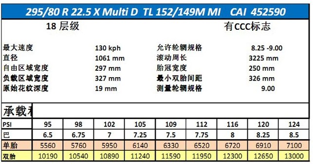 米其林韌其行X Multi D的規(guī)格為295/80 R22.5,于2013年3月起在國(guó)內(nèi)各大城市開始銷售。