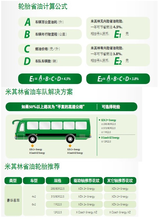 作為中國(guó)市場(chǎng)首發(fā)的驅(qū)動(dòng)軸專用省油輪胎產(chǎn)品,米其林XDA 2 Energy和XDA 2+ Energy,進(jìn)一步豐富了米其林省油輪胎產(chǎn)品線。自2006年面向中國(guó)卡客車輪胎市場(chǎng)率先推出第一條采用米其林Energy省油技術(shù)的輪胎米其林XZA 2+ Energy以來(lái),米其林向中國(guó)市場(chǎng)提供的多種不同規(guī)格、花紋的卡客車省油輪胎,共計(jì)為廣大米其林車隊(duì)用戶節(jié)省了超過(guò)一億升燃油,碳減排近24萬(wàn)噸,相當(dāng)于種植了728萬(wàn)棵成年樹(shù)木。作為卡客車省油輪胎市場(chǎng)的開(kāi)拓者和引領(lǐng)者,米其林不斷豐富自己的省油輪胎產(chǎn)品線,目前能夠提供8個(gè)規(guī)格、6種花紋的卡客車省油有內(nèi)胎和無(wú)內(nèi)胎輪胎產(chǎn)品,滿足包括中長(zhǎng)途高速客運(yùn)、貨運(yùn)以及城市公交運(yùn)輸在內(nèi)的不同行業(yè)對(duì)省油輪胎的需求,不僅為用戶帶來(lái)可觀的經(jīng)濟(jì)效益,更為社會(huì)創(chuàng)造了巨大的環(huán)保效益。
